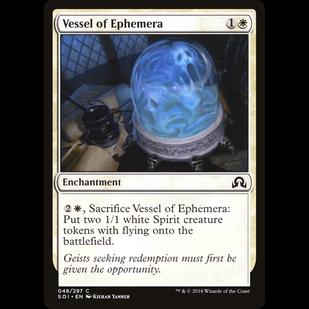 , Sacrifice Vessel of Ephemera: Create two 1/1 white Spirit creature tokens with flying.