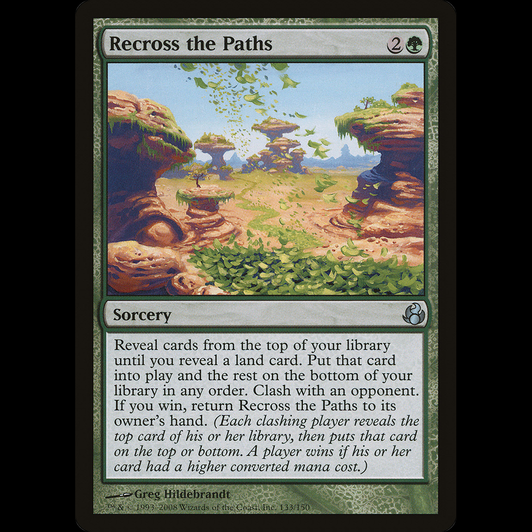 Reveal cards from the top of your library until you reveal a land card. Put that card onto the battlefield and the rest on the bottom of your library in any order. Clash with an opponent. If you win, return Recross the Paths to its owner's hand. (Each clashing player reveals the top card of their library, then puts that card on the top or bottom. A player wins if their card had a higher mana value.)