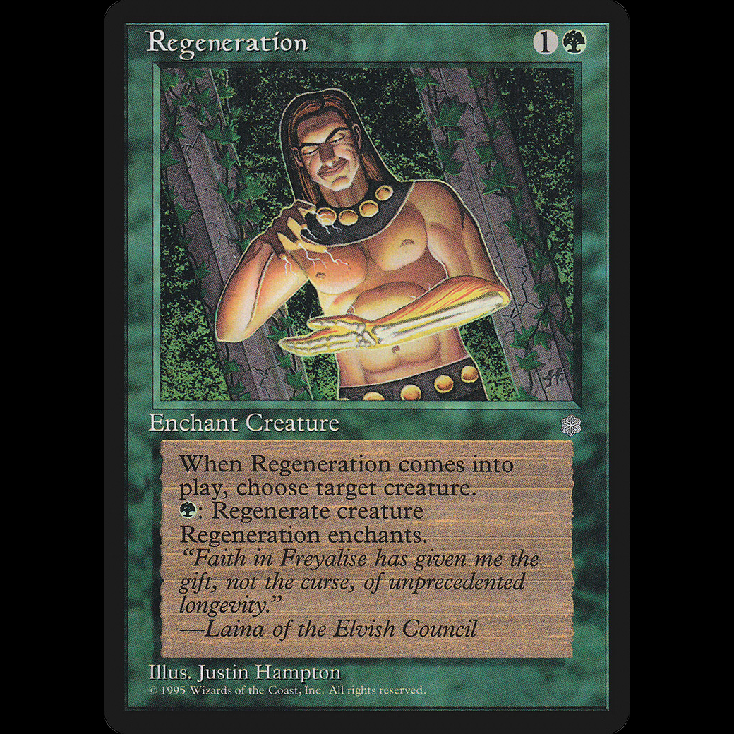: Regenerate enchanted creature. (The next time that creature would be destroyed this turn, it isn't. Instead tap it, remove all damage from it, and remove it from combat.)