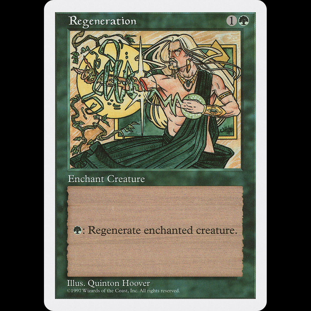 : Regenerate enchanted creature. (The next time that creature would be destroyed this turn, it isn't. Instead tap it, remove all damage from it, and remove it from combat.)