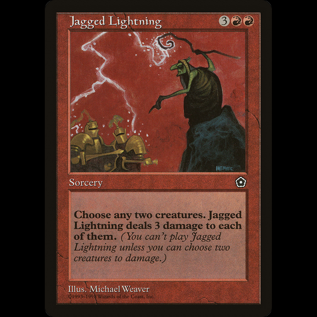 Jagged Lightning deals 3 damage to each of two target creatures.