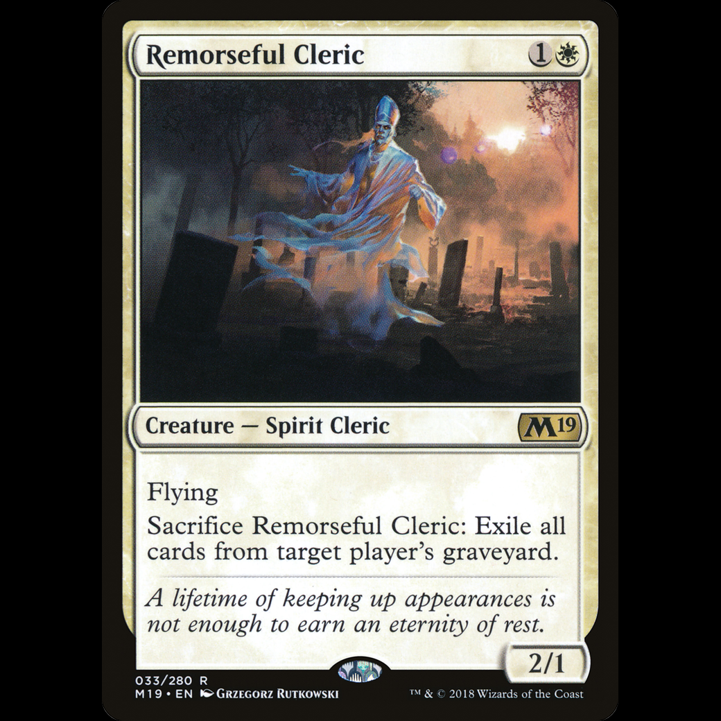 Sacrifice Remorseful Cleric: Exile target player's graveyard.