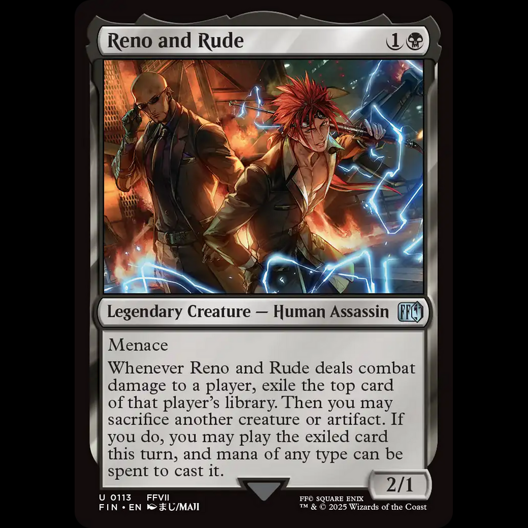 Whenever Reno and Rude deals combat damage to a player, exile the top card of that player's library. Then you may sacrifice another creature or artifact. If you do, you may play the exiled card this turn, and mana of any type can be spent to cast it.