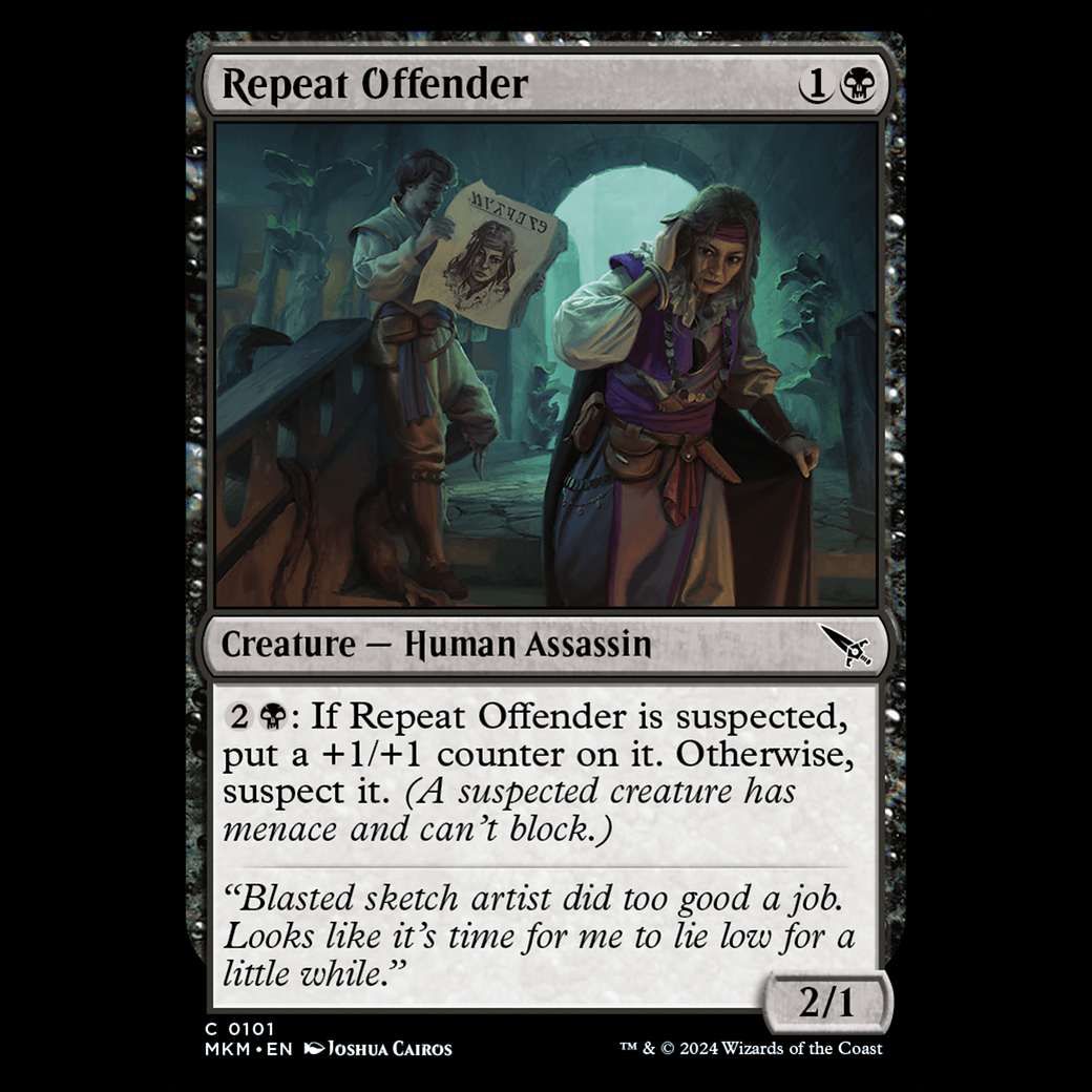: If Repeat Offender is suspected, put a +1/+1 counter on it. Otherwise, suspect it. (A suspected creature has menace and can't block.)