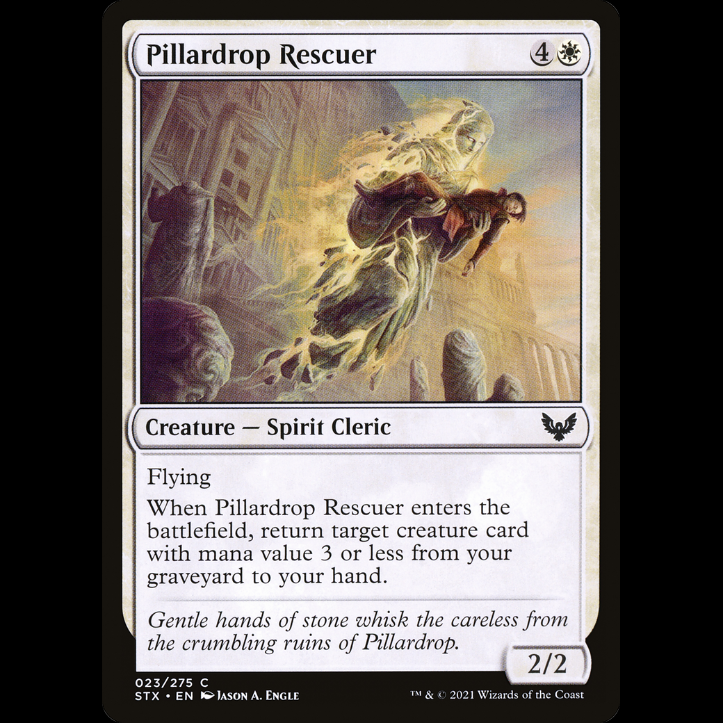 MTG Rescatadora de Barrancolumna (Pillardrop Rescuer) Strixhaven: School of Mages stx#23Flying When this creature enters, return target creature card with mana value 3 or less from your graveyard to your hand.