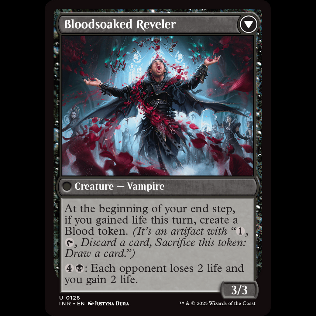 At the beginning of your end step, if you gained life this turn, create a Blood token. (It's an artifact with ", , Discard a card, Sacrifice this token: Draw a card.")