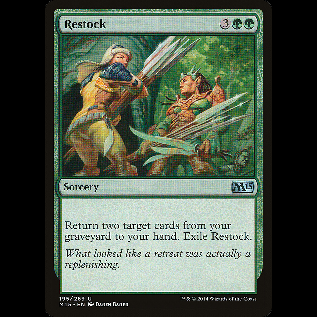 Return two target cards from your graveyard to your hand. Exile Restock.