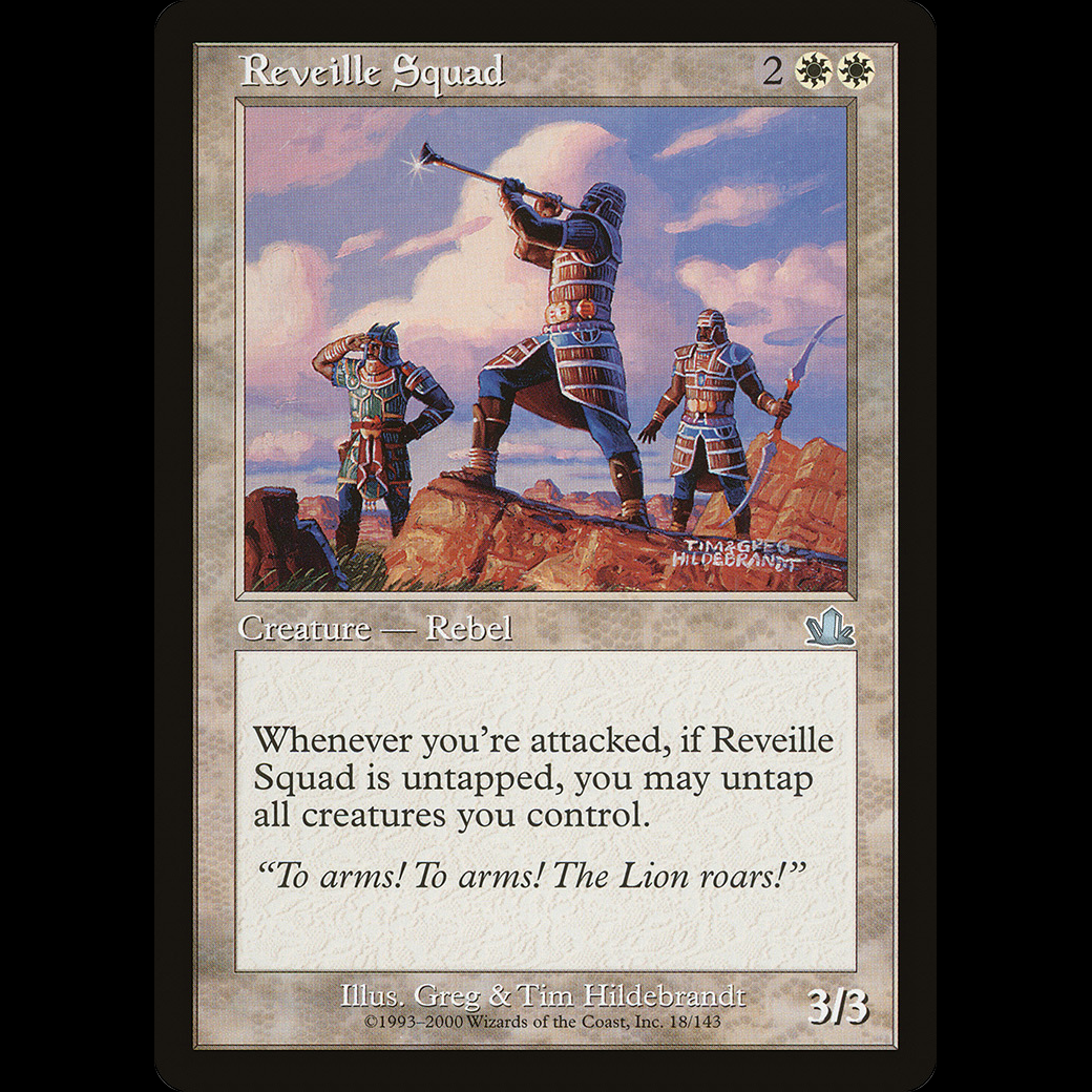 Whenever one or more creatures attack you, if Reveille Squad is untapped, you may untap all creatures you control.