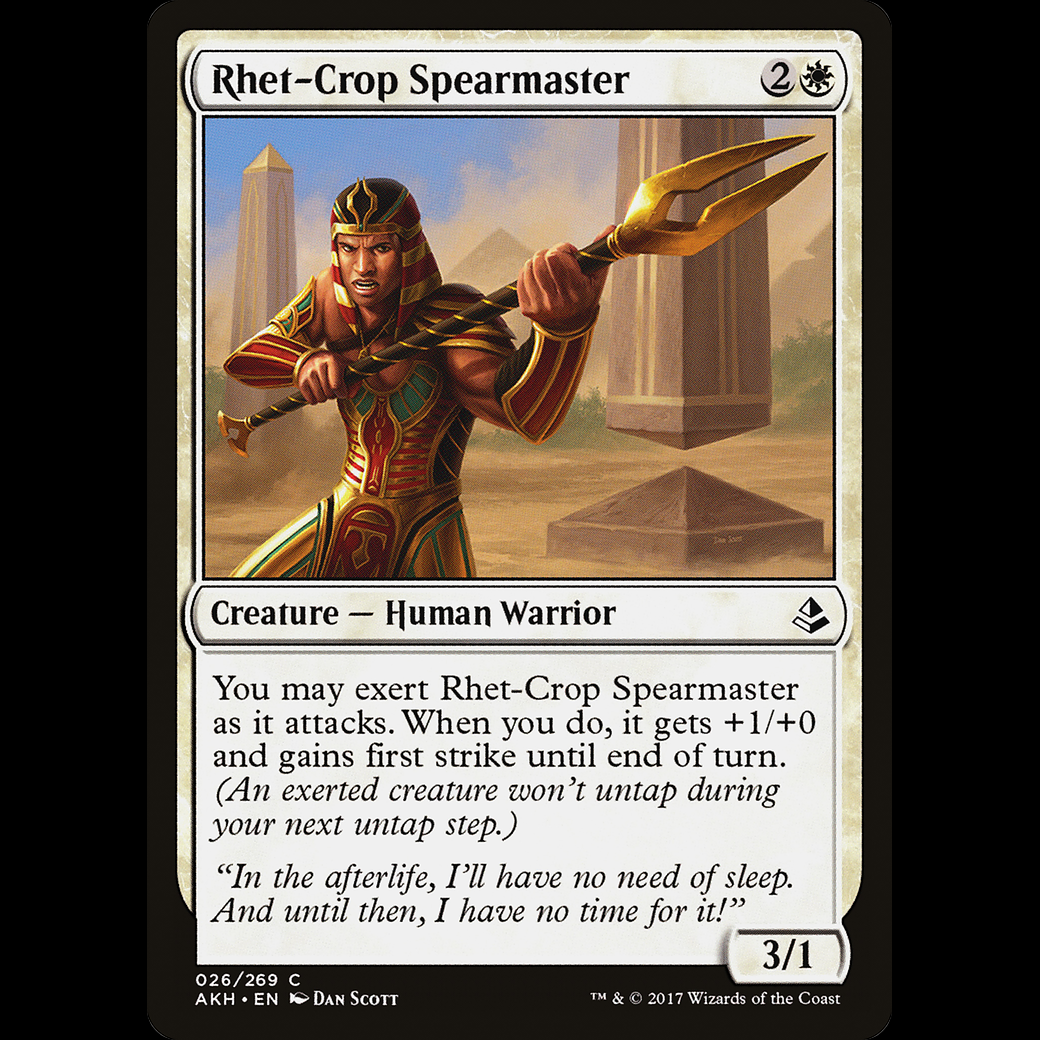 You may exert Rhet-Crop Spearmaster as it attacks. When you do, it gets +1/+0 and gains first strike until end of turn. (An exerted creature won't untap during your next untap step.)