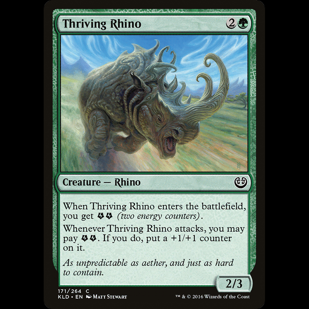 When Thriving Rhino enters the battlefield, you get (two energy counters).