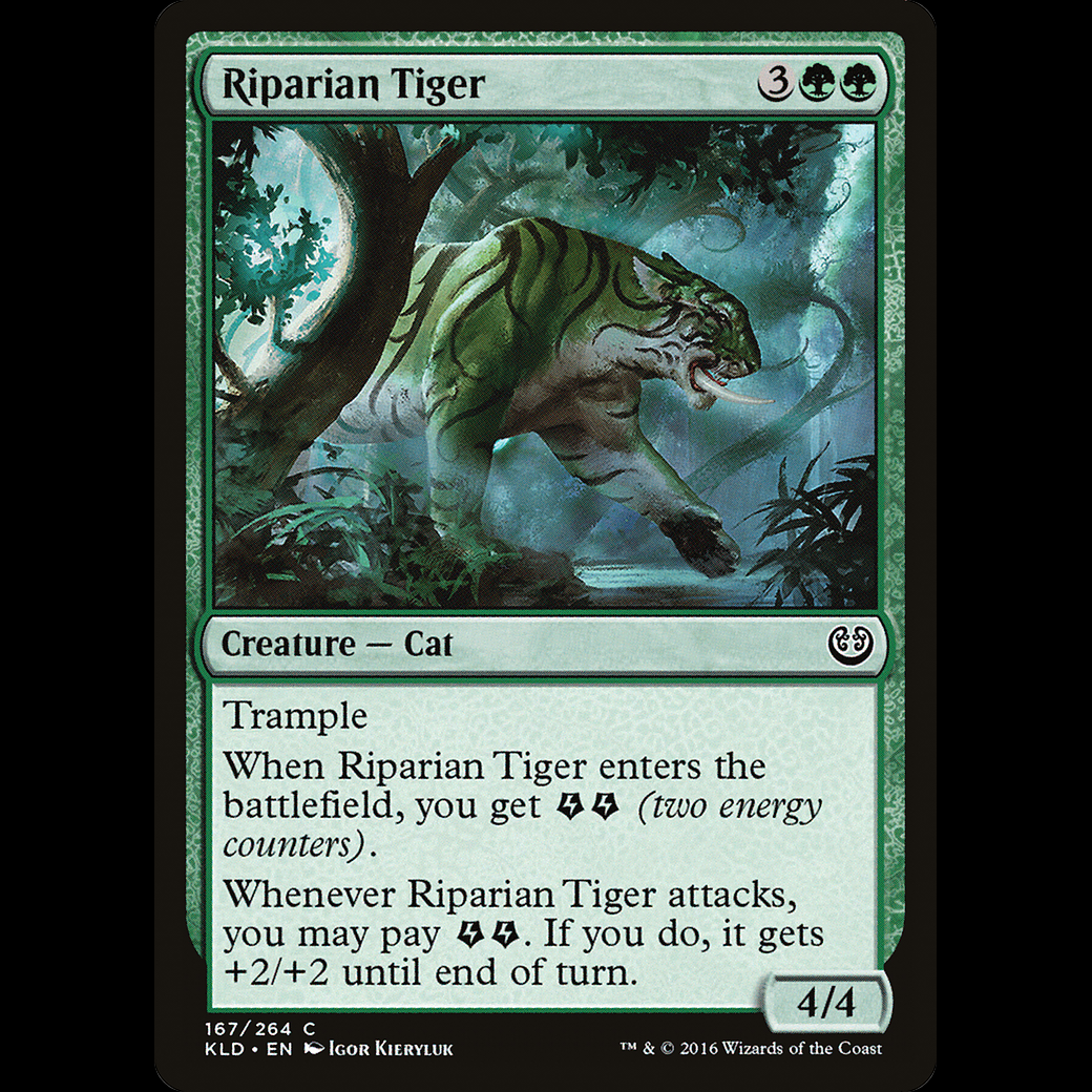 When Riparian Tiger enters the battlefield, you get (two energy counters).