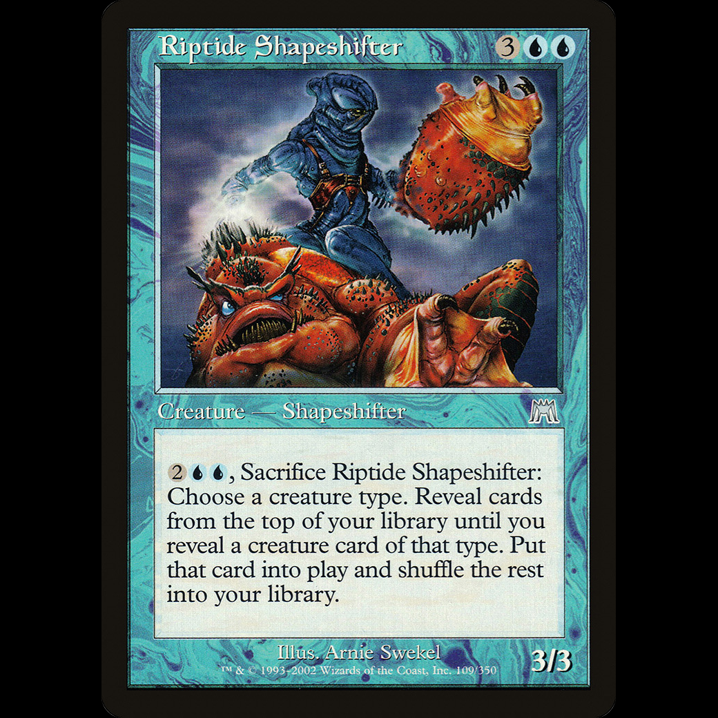 , Sacrifice Riptide Shapeshifter: Choose a creature type. Reveal cards from the top of your library until you reveal a creature card of that type. Put that card onto the battlefield and shuffle the rest into your library.