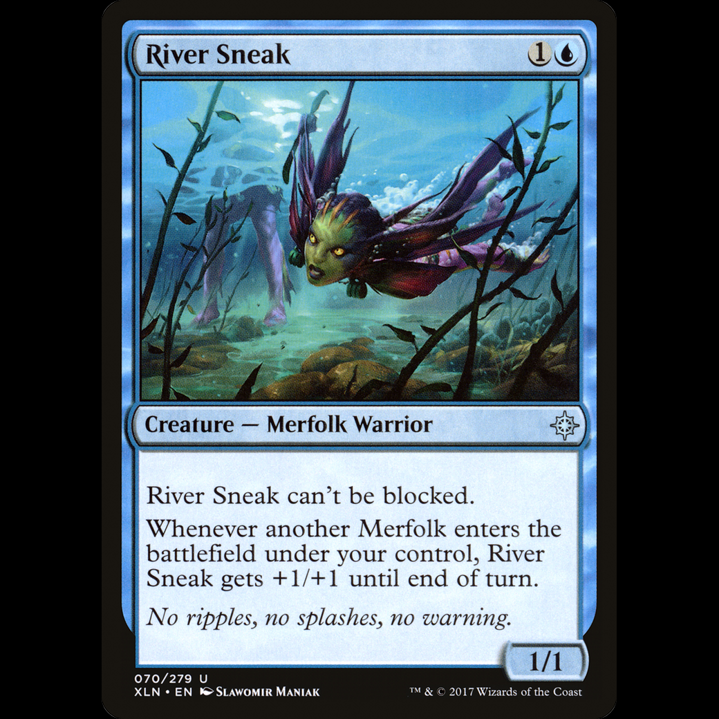 Whenever another Merfolk enters the battlefield under your control, River Sneak gets +1/+1 until end of turn.