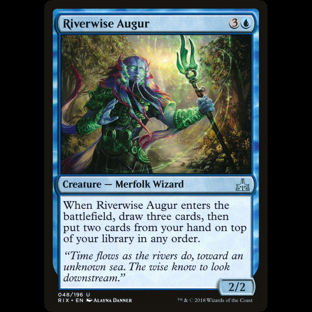 When Riverwise Augur enters the battlefield, draw three cards, then put two cards from your hand on top of your library in any order.