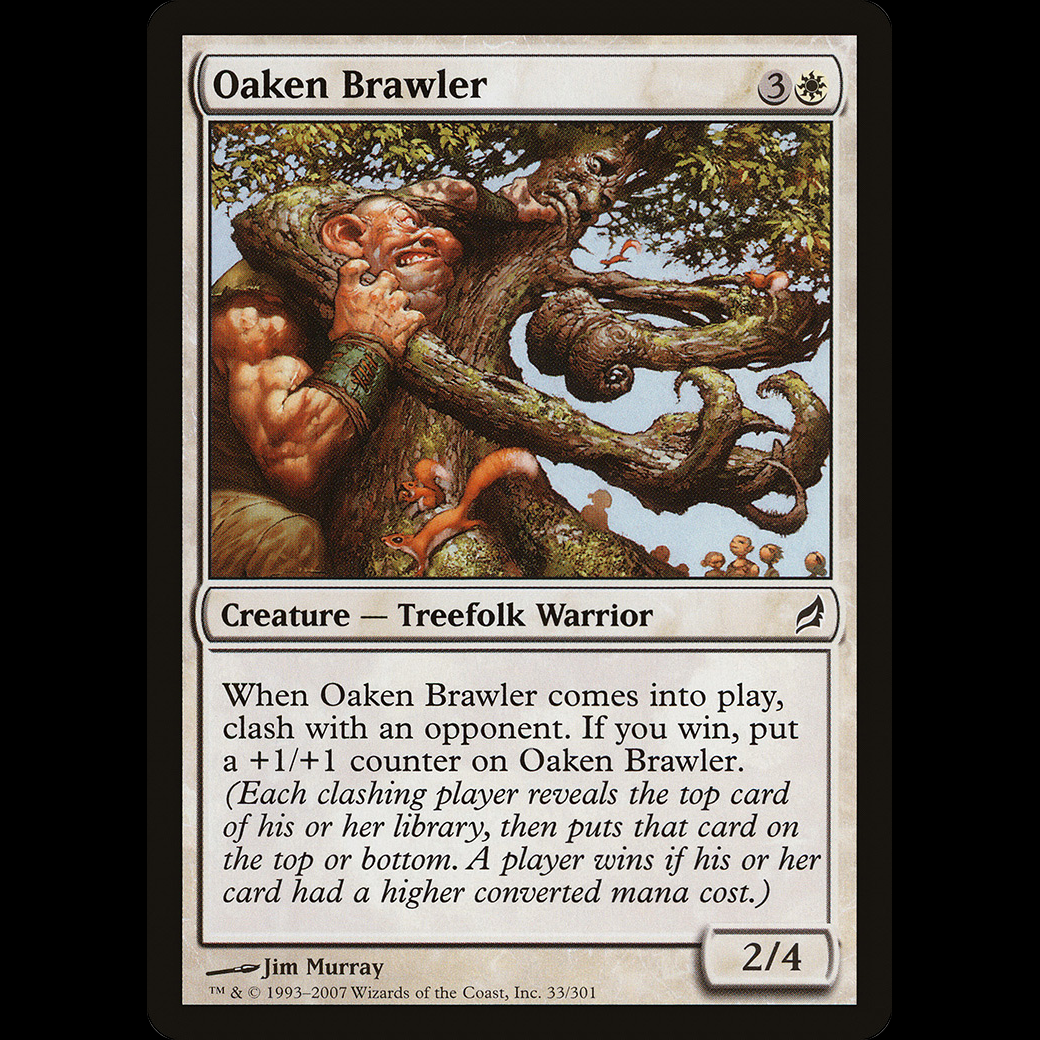 When Oaken Brawler enters the battlefield, clash with an opponent. If you win, put a +1/+1 counter on Oaken Brawler. (Each clashing player reveals the top card of their library, then puts that card on the top or bottom. A player wins if their card had a higher mana value.)