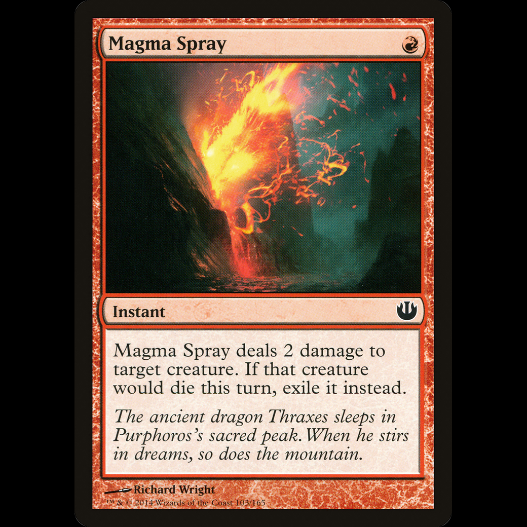 Magma Spray deals 2 damage to target creature. If that creature would die this turn, exile it instead.