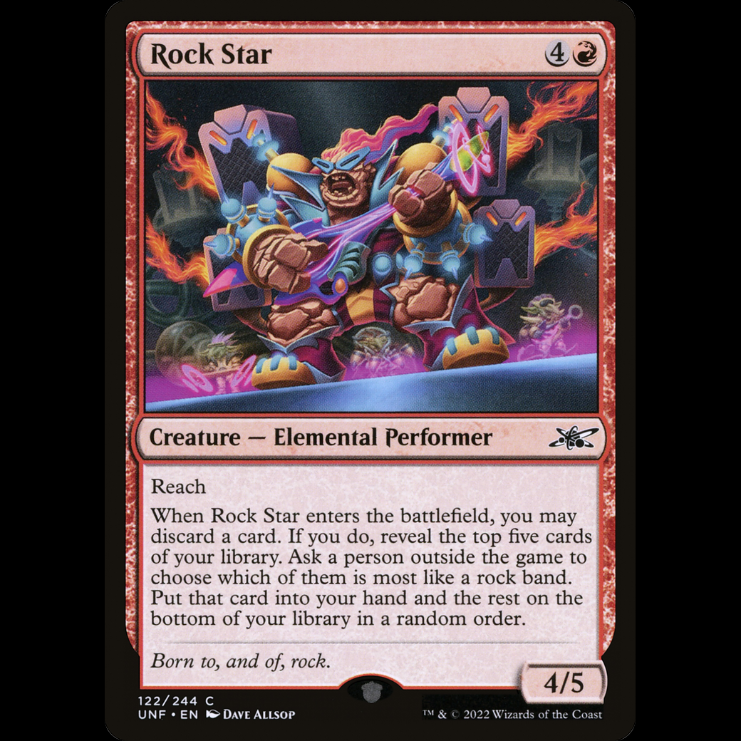 When this creature enters, you may discard a card. If you do, reveal the top five cards of your library. Ask a person outside the game to choose which of them is most like a rock band. Put that card into your hand and the rest on the bottom of your library in a random order.