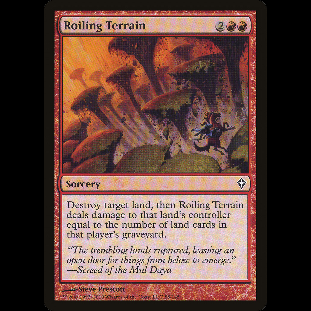Destroy target land, then Roiling Terrain deals damage to that land's controller equal to the number of land cards in that player's graveyard.