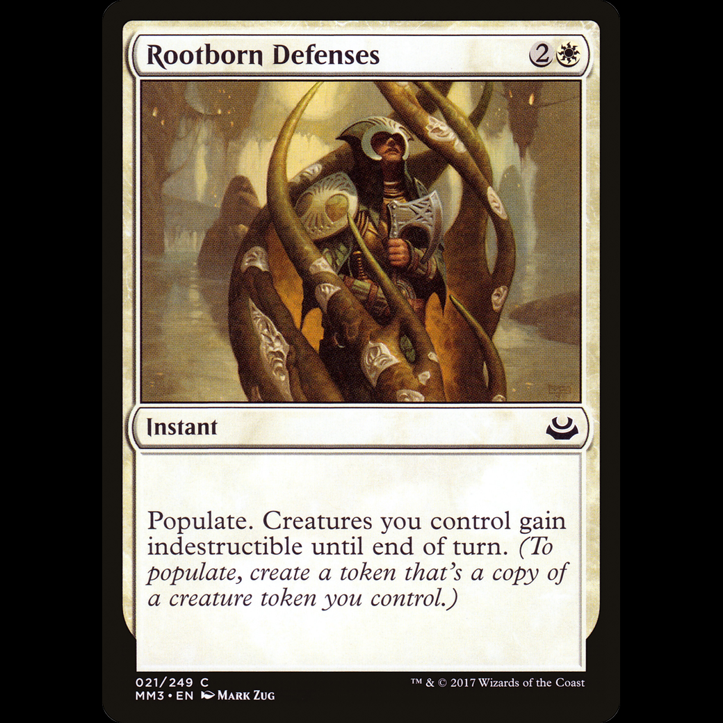 Populate. Creatures you control gain indestructible until end of turn. (To populate, create a token that's a copy of a creature token you control.)