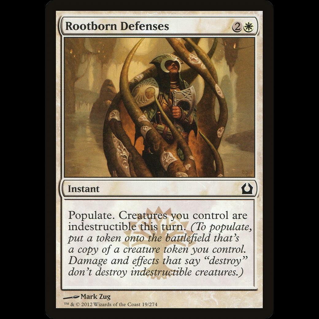 Populate. Creatures you control gain indestructible until end of turn. (To populate, create a token that's a copy of a creature token you control.)