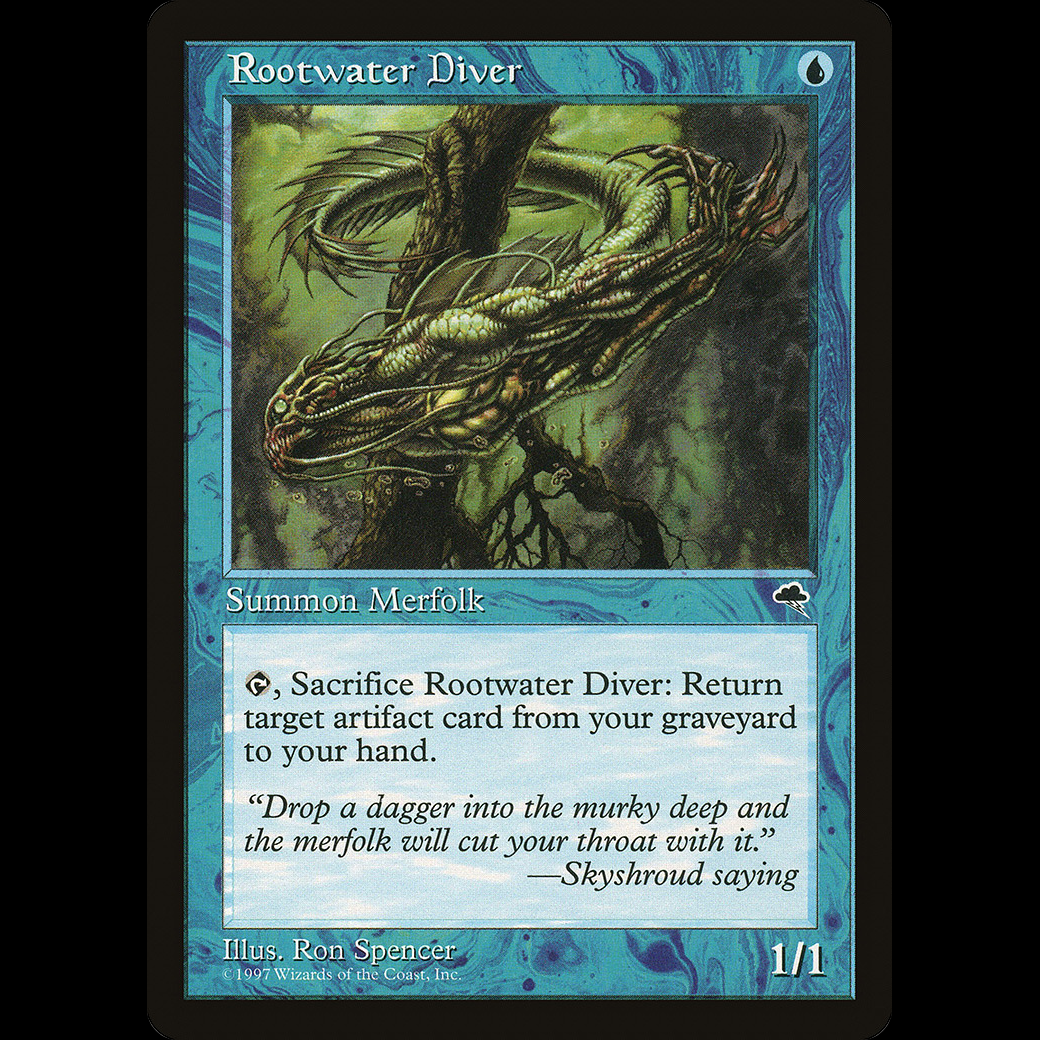 , Sacrifice Rootwater Diver: Return target artifact card from your graveyard to your hand.