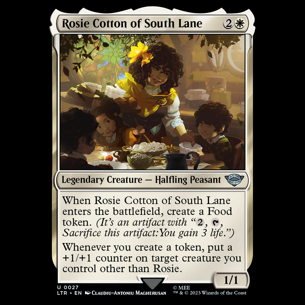 When Rosie Cotton of South Lane enters, create a Food token. (It's an artifact with ", , Sacrifice this artifact: You gain 3 life.")