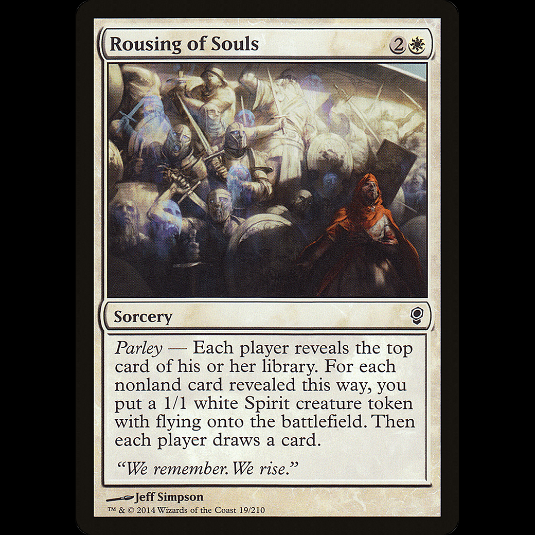 Parley — Each player reveals the top card of their library. For each nonland card revealed this way, you create a 1/1 white Spirit creature token with flying. Then each player draws a card.