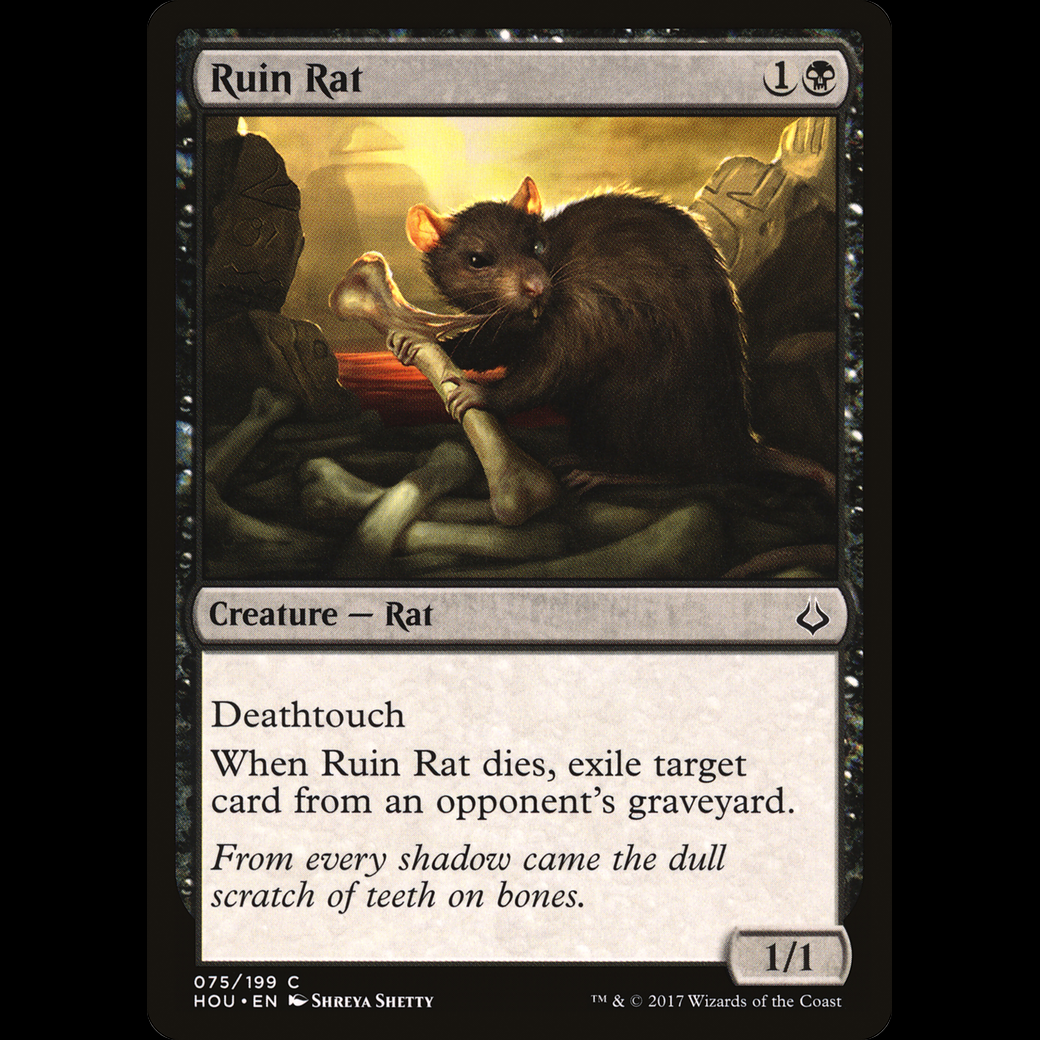 When Ruin Rat dies, exile target card from an opponent's graveyard.