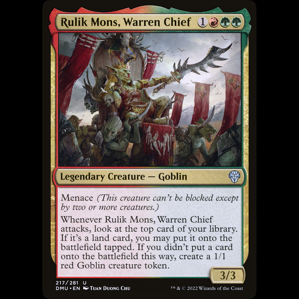 Whenever Rulik Mons attacks, look at the top card of your library. If it's a land card, you may put it onto the battlefield tapped. If you didn't put a card onto the battlefield this way, create a 1/1 red Goblin creature token.