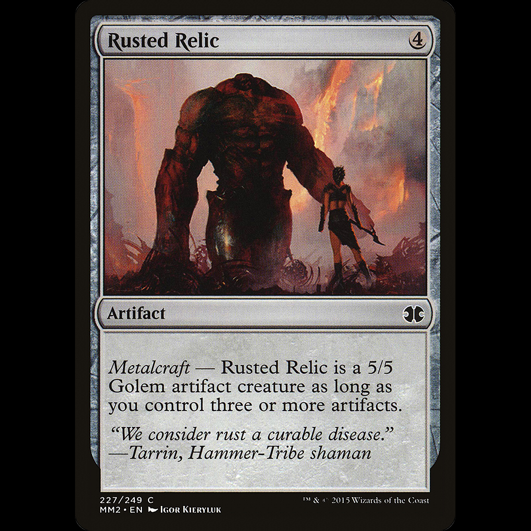 Metalcraft — Rusted Relic is a 5/5 Golem artifact creature as long as you control three or more artifacts.