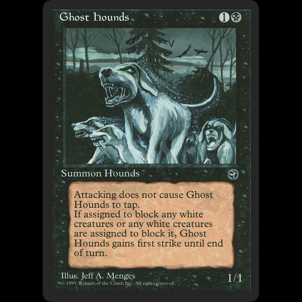 Whenever Ghost Hounds blocks or becomes blocked by a white creature, Ghost Hounds gains first strike until end of turn.