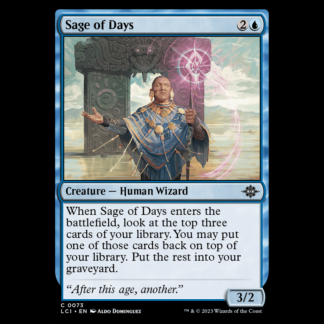 When Sage of Days enters the battlefield, look at the top three cards of your library. You may put one of those cards back on top of your library. Put the rest into your graveyard.