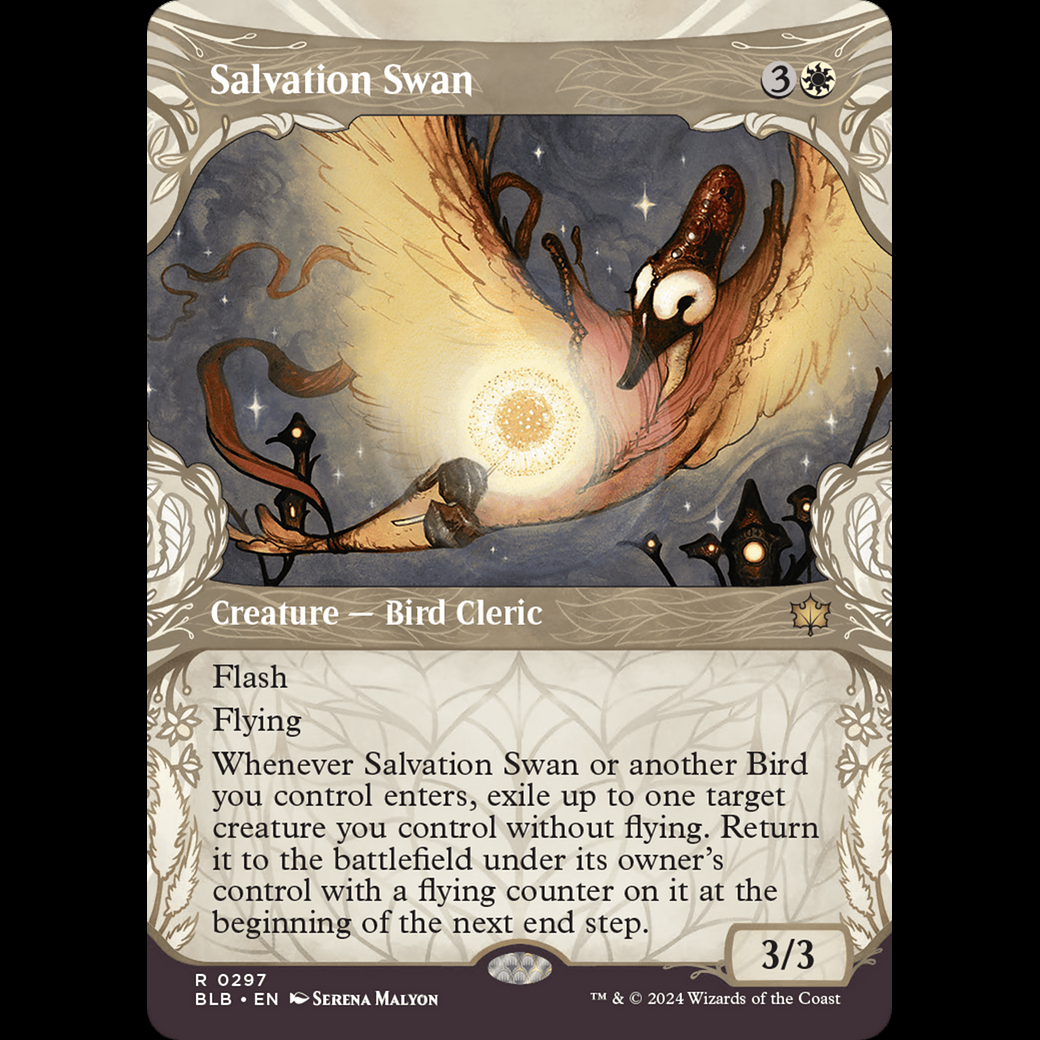 Whenever Salvation Swan or another Bird you control enters, exile up to one target creature you control without flying. Return it to the battlefield under its owner's control with a flying counter on it at the beginning of the next end step.