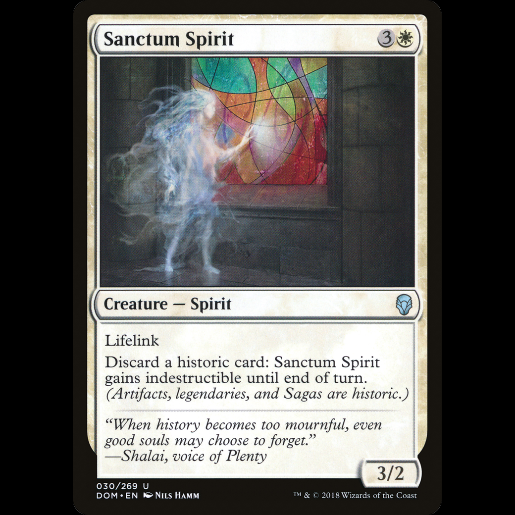 Discard a historic card: Sanctum Spirit gains indestructible until end of turn. (Artifacts, legendaries, and Sagas are historic.)