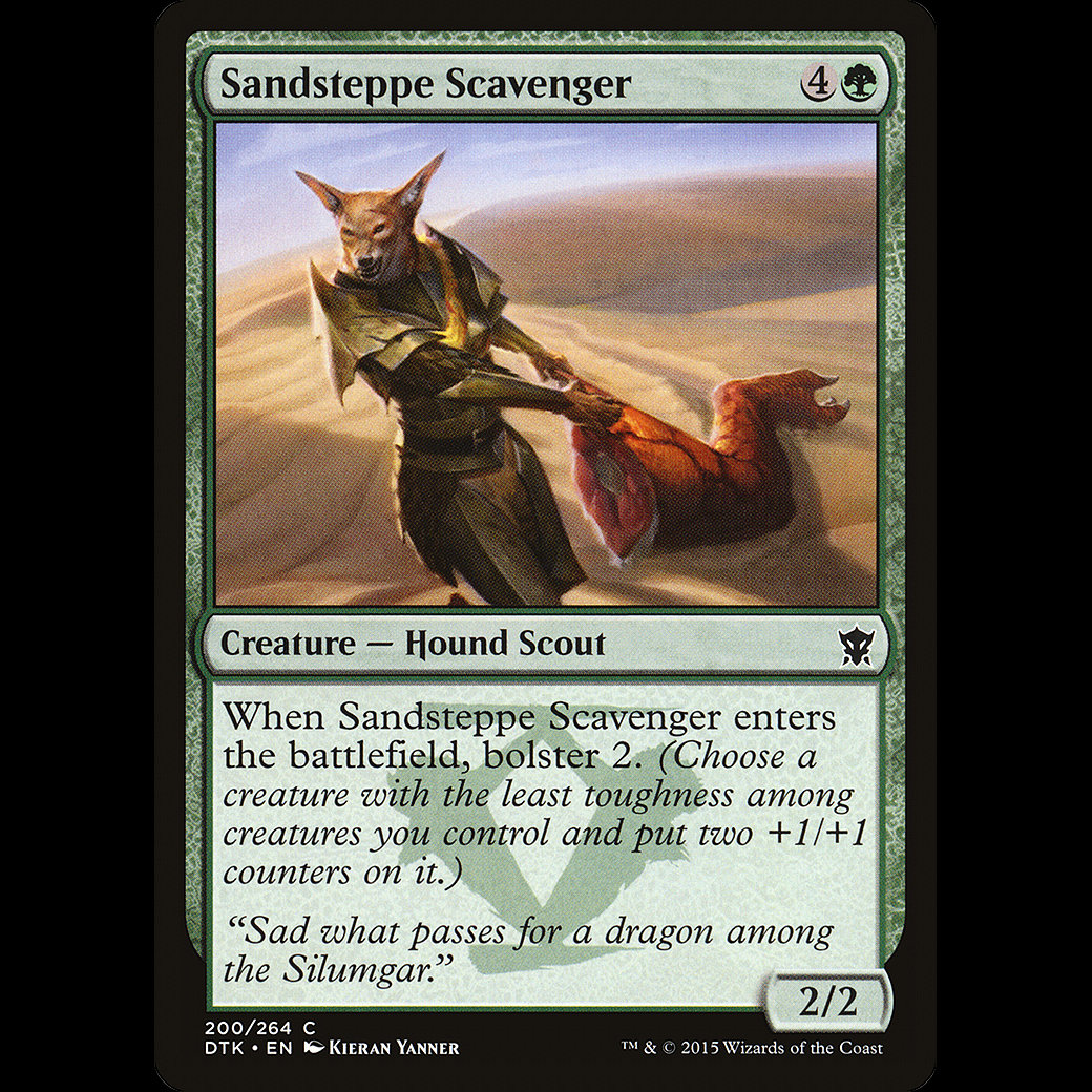 When Sandsteppe Scavenger enters the battlefield, bolster 2. (Choose a creature with the least toughness among creatures you control and put two +1/+1 counters on it.)