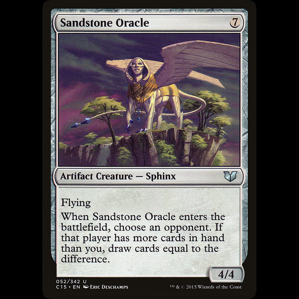 When Sandstone Oracle enters, choose an opponent. If that player has more cards in hand than you, draw cards equal to the difference.
