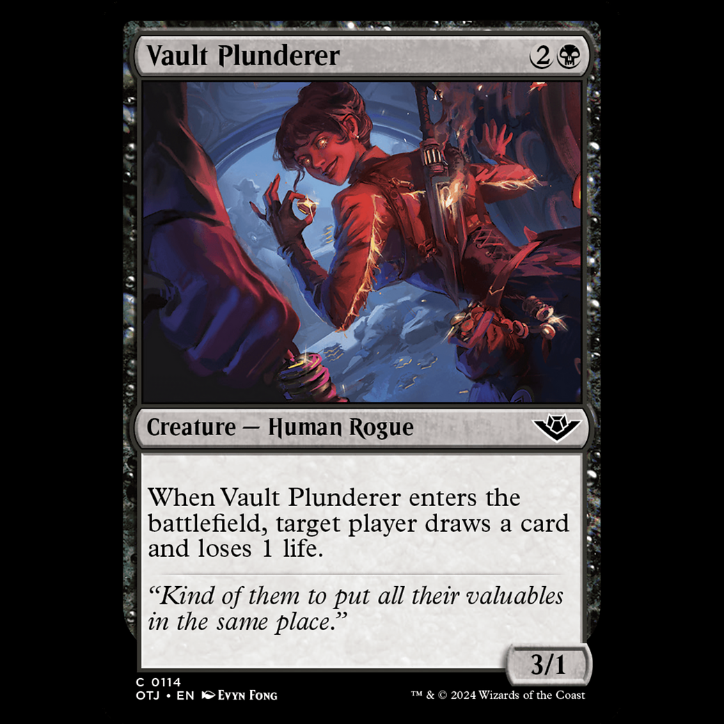 MTG Saqueadora de cámaras (Vault Plunderer) Outlaws of Thunder Junction otj#114 When Vault Plunderer enters, target player draws a card and loses 1 life.