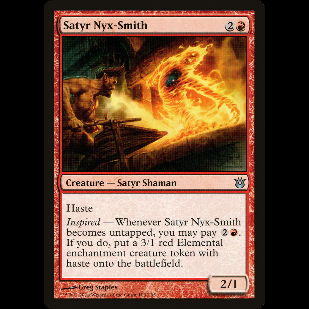 Inspired — Whenever Satyr Nyx-Smith becomes untapped, you may pay . If you do, create a 3/1 red Elemental enchantment creature token with haste.