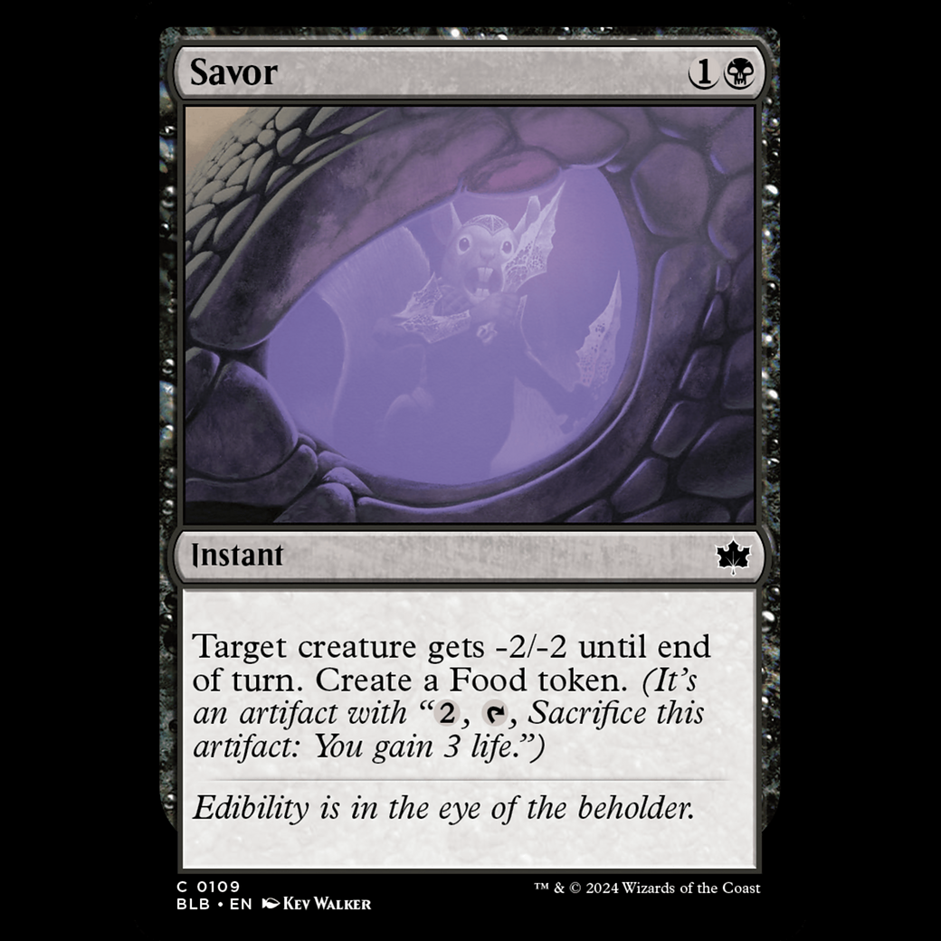 Target creature gets -2/-2 until end of turn. Create a Food token. (It's an artifact with ", , Sacrifice this artifact: You gain 3 life.")