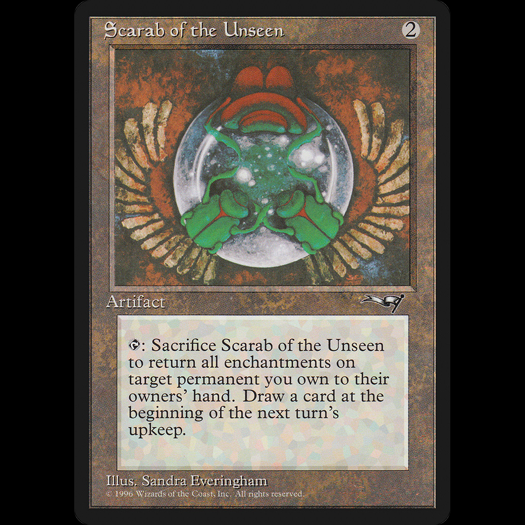 , Sacrifice Scarab of the Unseen: Return all Auras attached to target permanent you own to their owners' hands. Draw a card at the beginning of the next turn's upkeep.