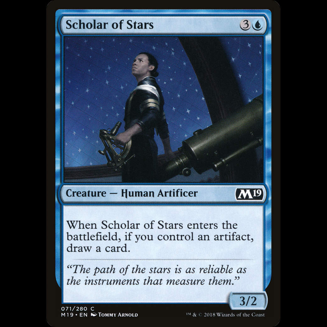 When Scholar of Stars enters the battlefield, if you control an artifact, draw a card.