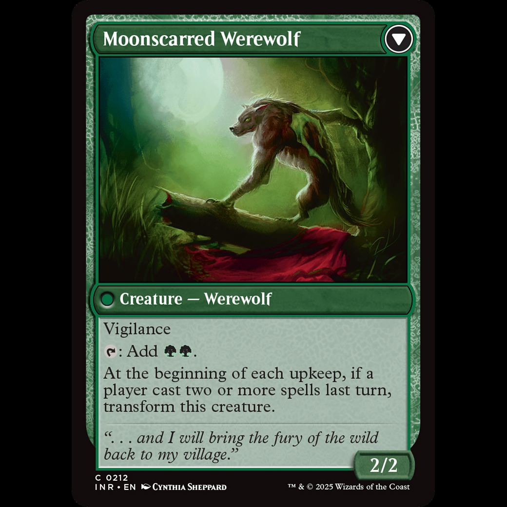 At the beginning of each upkeep, if a player cast two or more spells last turn, transform Moonscarred Werewolf.