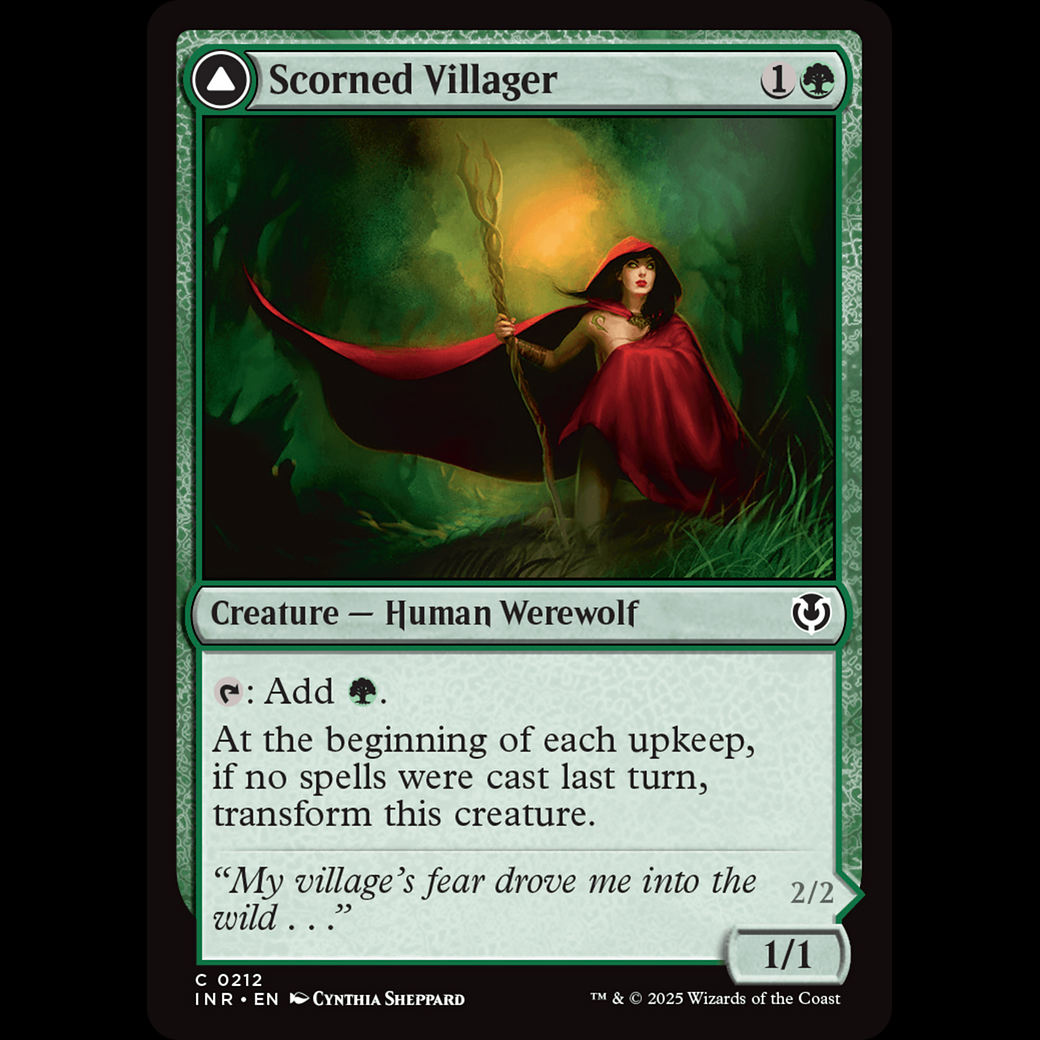 At the beginning of each upkeep, if no spells were cast last turn, transform Scorned Villager.