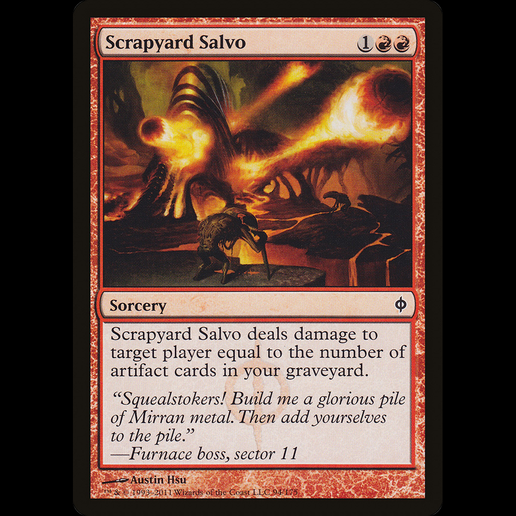 Scrapyard Salvo deals damage to target player or planeswalker equal to the number of artifact cards in your graveyard.
