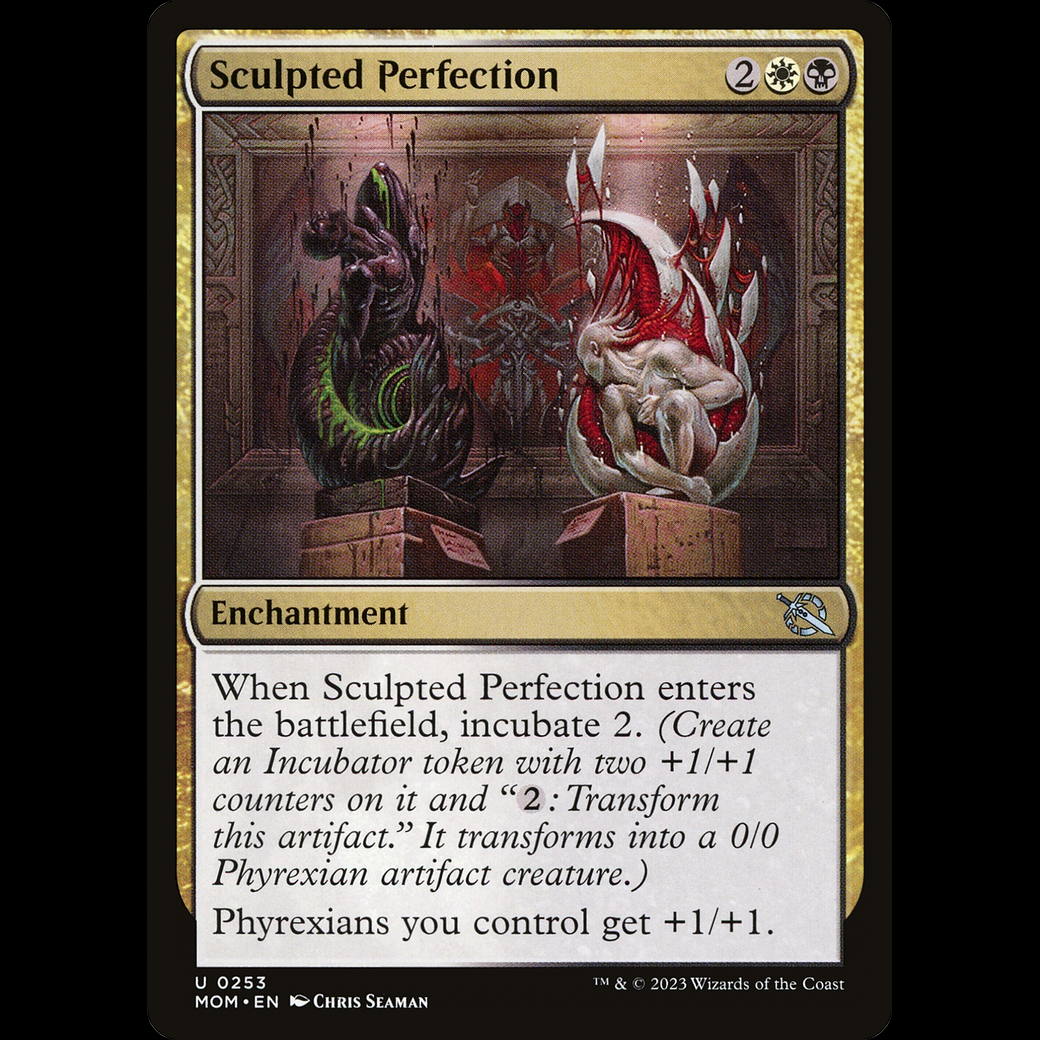 When Sculpted Perfection enters the battlefield, incubate 2. (Create an Incubator token with two +1/+1 counters on it and ": Transform this artifact." It transforms into a 0/0 Phyrexian artifact creature.)