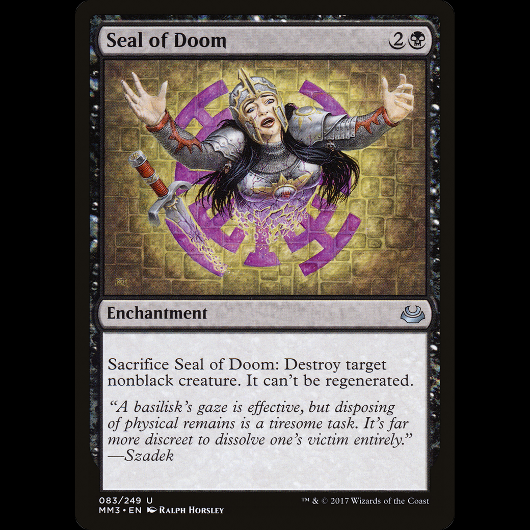 Sacrifice Seal of Doom: Destroy target nonblack creature. It can't be regenerated.