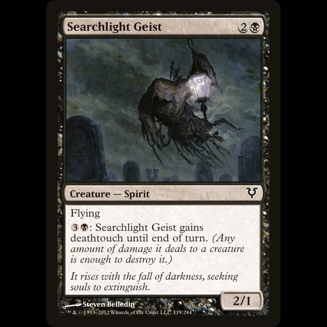 : Searchlight Geist gains deathtouch until end of turn. (Any amount of damage it deals to a creature is enough to destroy it.)