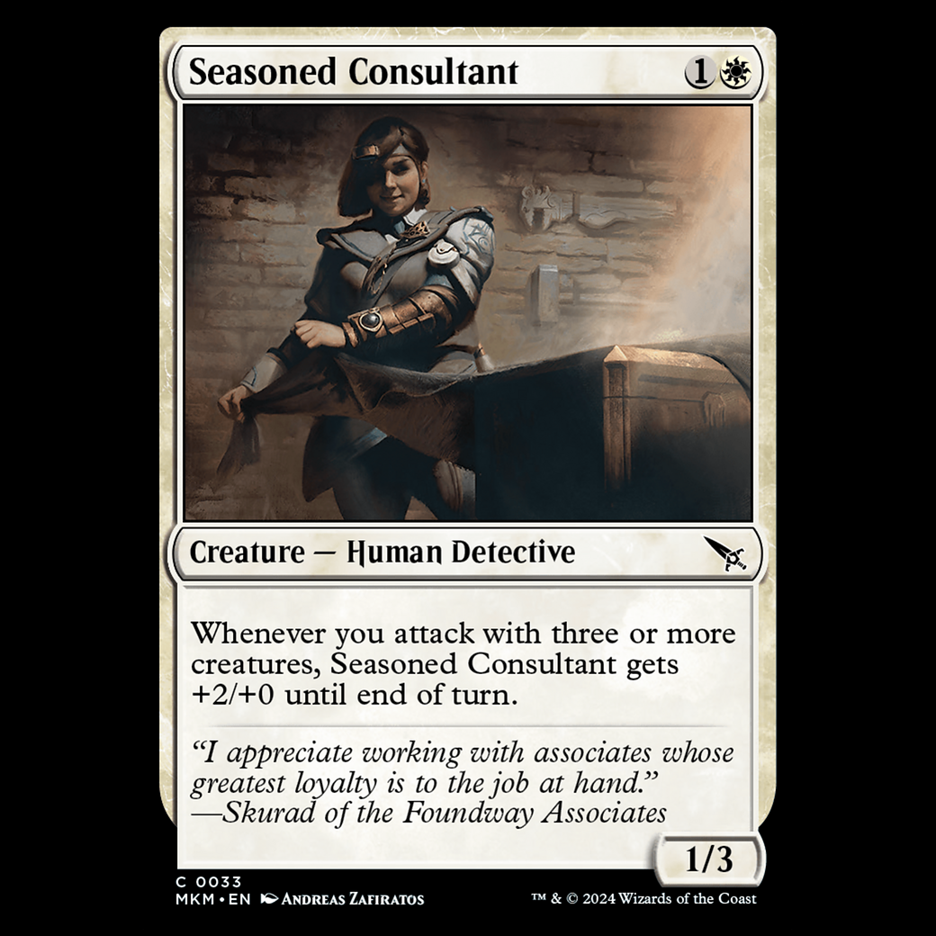 Whenever you attack with three or more creatures, Seasoned Consultant gets +2/+0 until end of turn.