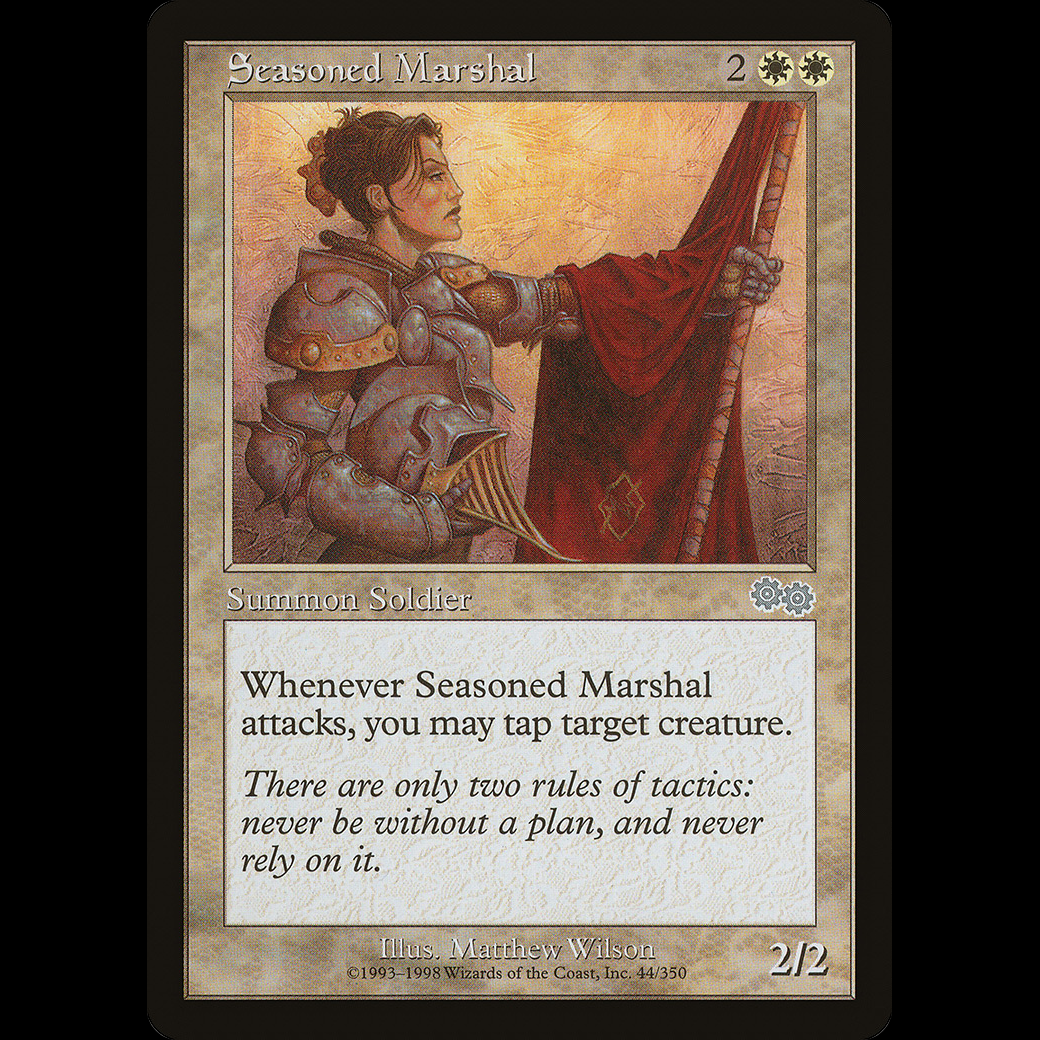 Whenever Seasoned Marshal attacks, you may tap target creature.
