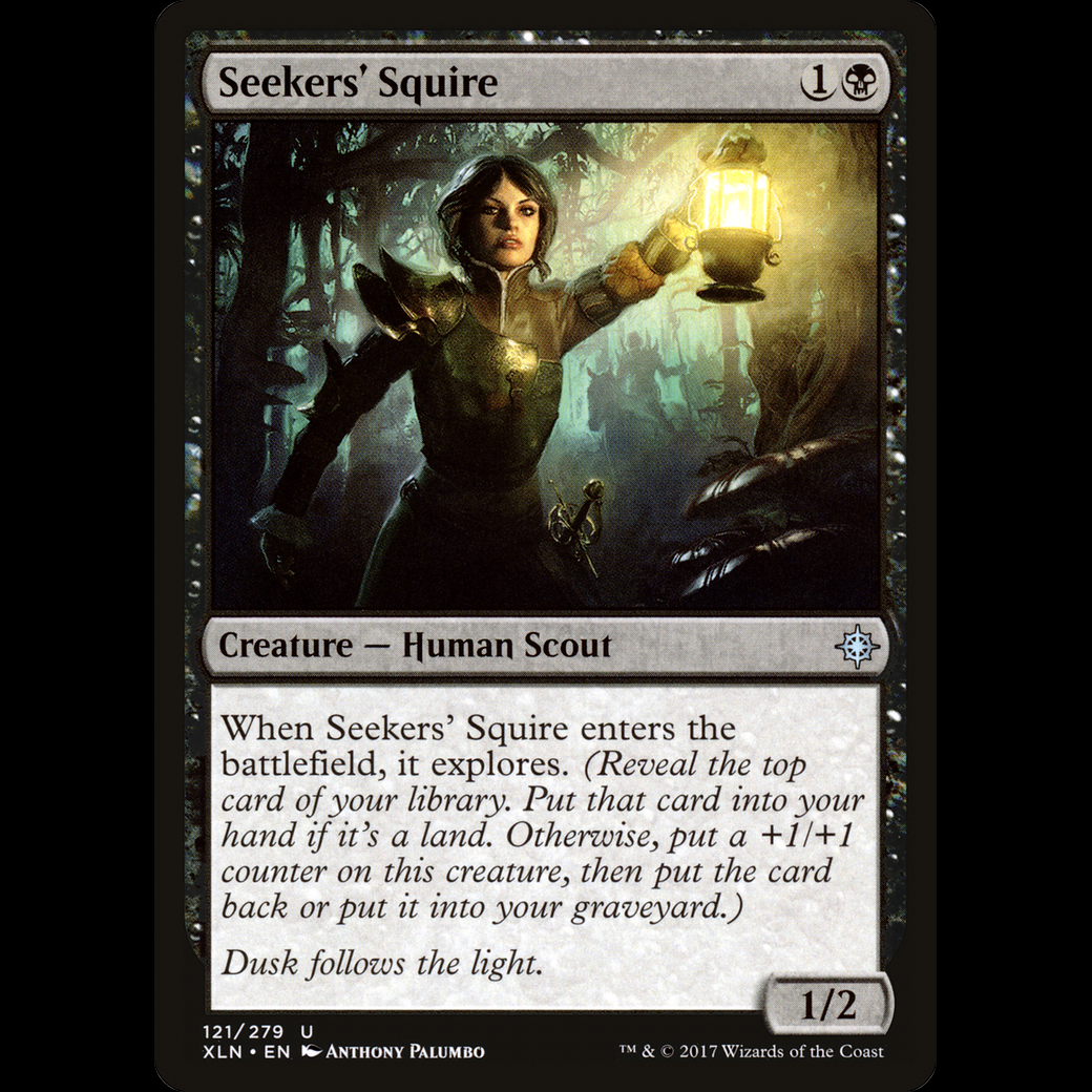 When Seekers' Squire enters the battlefield, it explores. (Reveal the top card of your library. Put that card into your hand if it's a land. Otherwise, put a +1/+1 counter on this creature, then put the card back or put it into your graveyard.)